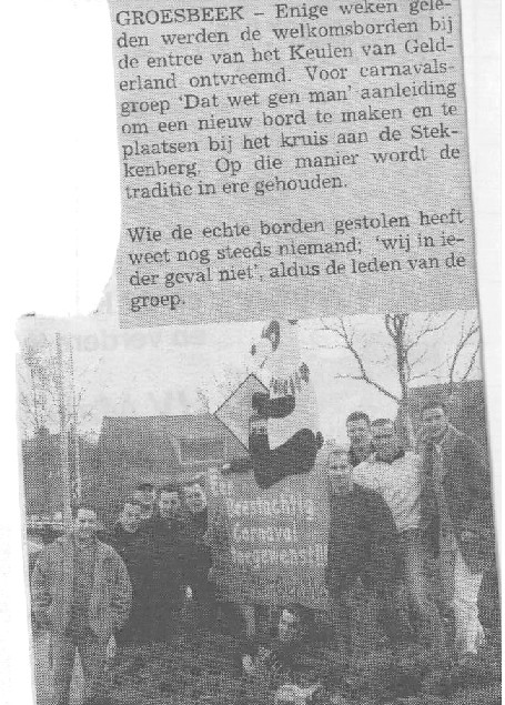 Groesbeeks weekblad 17-02-2004, de leden van da wet gen man hebben een nieuw bord geplaatst op het kruus in Groesbeek. The Pimp Daddy ontbreekt op de foto. |